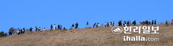 29일 제주시 애월읍 봉성리 새별오름 정상에 오른 탐방객들이 파란하늘을 배경으로 제주의 늦가을 정취를 즐기고 있다. 강희만기자