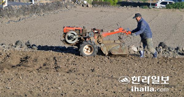 28일 제주시 이호동 한 농경지에서 농민이 경운기를 이용해 밭을 갈고 있다. 강희만기자
