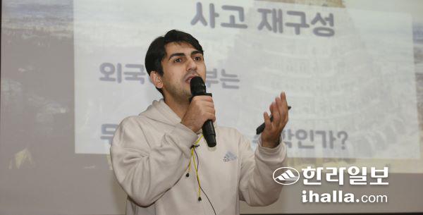 1일 제주외국어고등학교 시청각실에서 3학년 학생을 대상으로 열린 '스타강사와 함께하는 JDC 톡톡튀는 교육특강(23탄)'에서 알파고 시마씨 씨가 강의를 하고 있다. 이상국기자