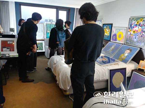 지난달 25일 아트제주 VIP 프리뷰를 찾은 관람객들이 호텔 룸에 마련된 갤러리 부스를 둘러보고 있다. 진선희기자
