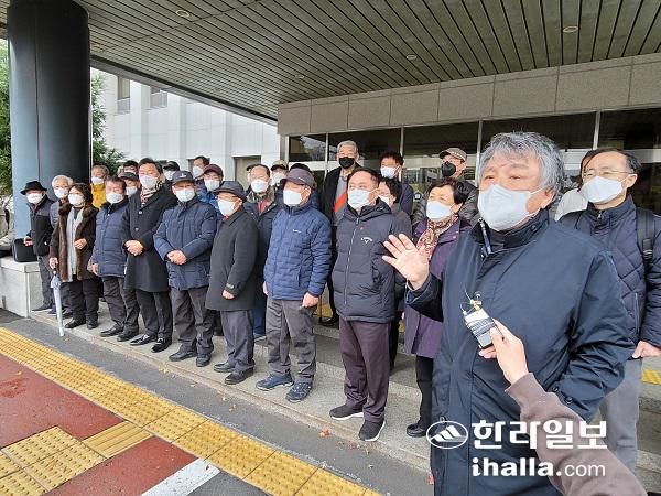 1일 제주지법 앞에서 이번 재심 청구를 이끌고 있는 양동윤 제주4·3도민연대 대표가 이날 심문기일 내용을 설명하고 있다. 송은범기자