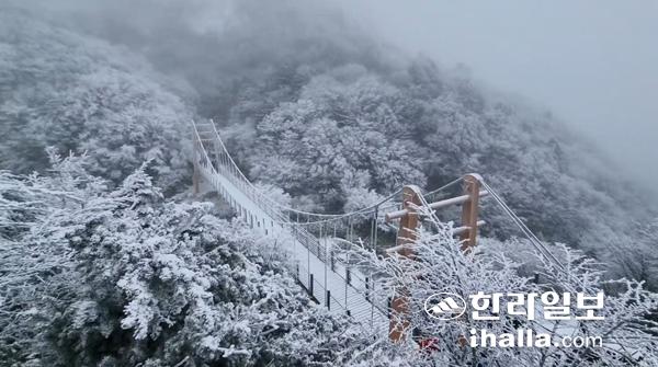 2일 오전 제주 한라산국립공원 관음사 등반코스에 있는 해발 1천560m의 용진각 계곡 구름다리인 현수교에 눈이 소복이 쌓여 있다.