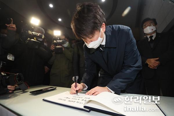 국민의힘 이준석 대표가 2일 오후 제주시 봉개동 4·3평화공원을 찾아 참배한 뒤 방명록을 작성하고 있다. 연합뉴스