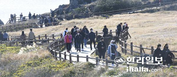 주말인 4일 서귀포시 성산읍 섭지코지를 찾은 관광객들이 즐거운 한때를 보내고 있다. 이상국기자