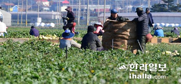 추위가 다소 풀린 6일 서귀포시 대정읍 신도리에서 농민들이 무 수확 작업에 분주한 모습이다. 강희만기자