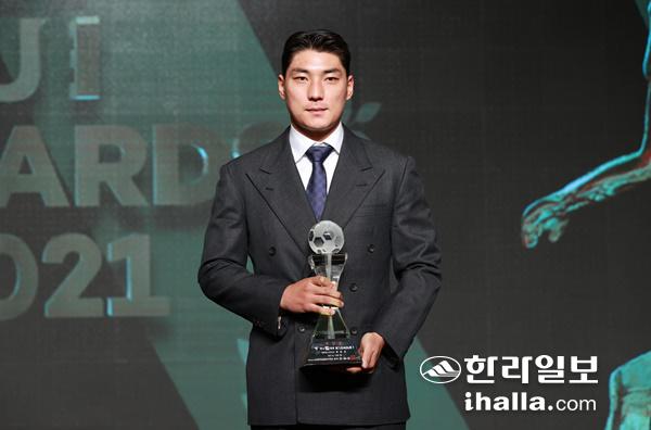제주 유나이티드 공격수 주민규가 7일 오후 서울 서대문구 스위스그랜드호텔에서 열린 2021 프로축구 K리그1 시상식에서 최다 득점상을 수상한 뒤 기념촬영을 하고 있다. 연합뉴스
