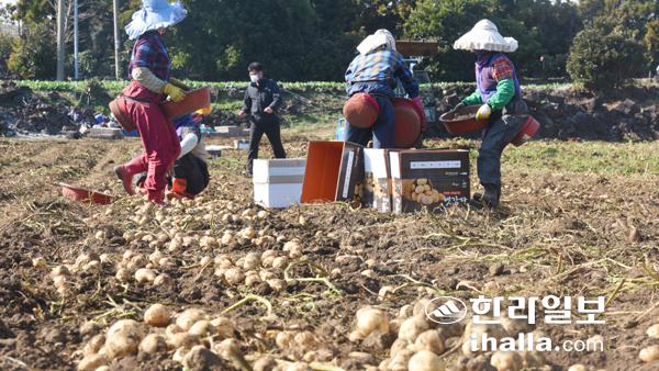 7일 서귀포시 대정읍 한 밭에서 농민들이 감자를 수확하고 있다. 이상국기자