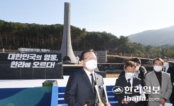 김부겸 총리가 8일 제주시 노형동에서 열린 국립제주호국원 개원식 행사에 참석한 후 기자들과 일문일답을 진행하고 있다. 이상국 기자