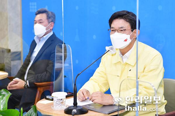 13일 제주도교육청 기자실에서 담화문 발표하는 이석문 제주자치도교육감. 이 자리에는 고덕훈 제주도학교운영위원장협의회장과 최재홍 제주대학교 소아과 감염분과 전문의가 함께 했다. 사진=제주도교육청 제공
