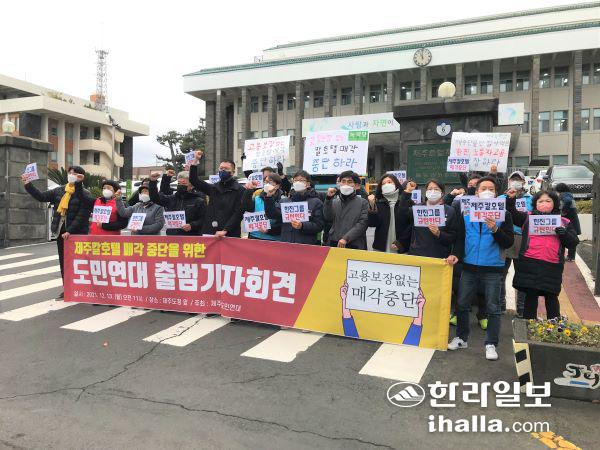 13일 제주도청 앞에서 \'제주칼호텔 매각 중단을 위한 도민연대\'가 출범식을 갖고 칼호텔 직원들에 대한 고용보장을 요구했다. 사진=김도영기자