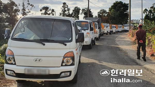 잦은 비날씨로 대과비율도 크게 늘며 농가에서의 처리난이 가중되고 있다.사진은 가공용감귤을 팔기 위해 13일 서귀포시 소재 산지유통센터 인근 이면도로에 길게 늘어선 차량들 모습. 백금탁 기자