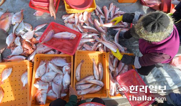 14일 서귀포시 강정동 포구 진입로 도로변에서 시민들이 당일 어획한 싱싱한 옥돔을 구매하고 있다. 강희만기자