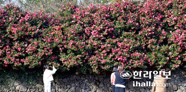 14일 평화로 인근 한 골프장 울타리에 만개한 애기동백을 배경으로 행인들이 사진을 찍고 있다. 강희만기자
