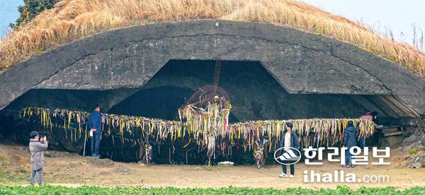15일 서귀포시 대정읍 알뜨르비행장을 찾은 관광객들이 비행기 격납고를 둘러보고 있다. 이상국기자