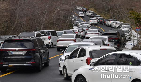 19일 한라산 등반객 차량들이 1100도로 영실진입로 도로 양쪽으로 주차하면서 차량 통행에 큰 혼잡이 벌어지고 있다. 강희만기자