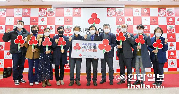 제주사회복지공동모금회(회장 강지언·이하 제주사랑의열매)는 지난 16일, 도내 긴급한 복지수요 대응체계 구축을 위해 4개 사회복지기관에 '제주사랑의열매 2차 복지현안지원사업'지원금 3500만원을 전달했다.