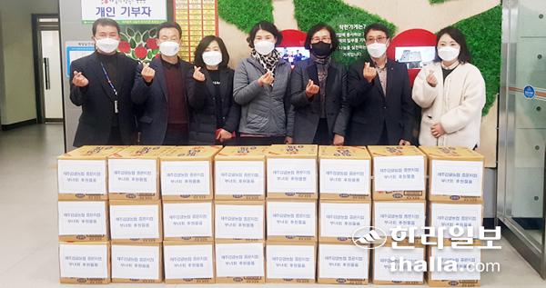 제주감귤농협 중문지점 부녀회(회장 박영옥)는 지난 16일 농약빈병 사업 수익금으로 라면(60만원 상당)을 중문지역 3개주민센터에 기부했다.