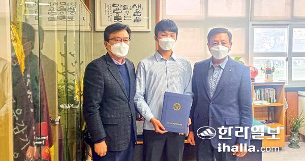새마을지도자제주도협의회 안창준 회장은 지난 17일 제주중학교(교장 강봉석)를 방문해 2학년에 재학 중인 김범준 학생에게 장학금 100만원을 전달했다.