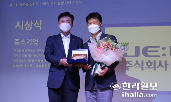 김한상 (주)제우스 대표가 사회적 가치 실현 대상 시상식에서 수상하고 있는 모습.