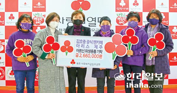 가수 김호중 공식 팬카페 '아리스 제주(리더 해바라기제주)'는 지난 21일 제주사회복지공동모금회(회장 강지언)를 방문해 지역사회 어려운 어르신을 위해 사용해 달라며 266만원 상당의 위생용품을 기탁했다.