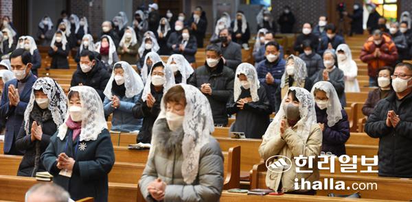 성탄절인 25일 천주교 제주교구 주교좌 중앙성당에서 코로나19 속 성탄의 참된 의미를 새기는 성탄 대축일 미사가 열리고 있다. 이상국기자