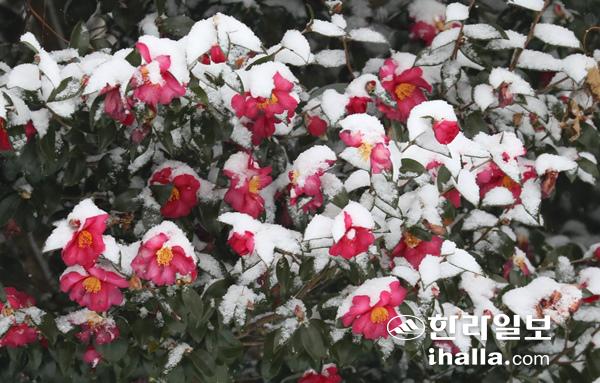 폭설이 쏟아진 26일 오후 제주시 조천읍의 한 주택가 동백나무에 하얀 눈이 쌓여 있다. 연합뉴스