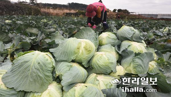 28일 제주시 애월읍 한 밭에서 농민들이 양배추 수확을 하고 있다. 이상국기자
