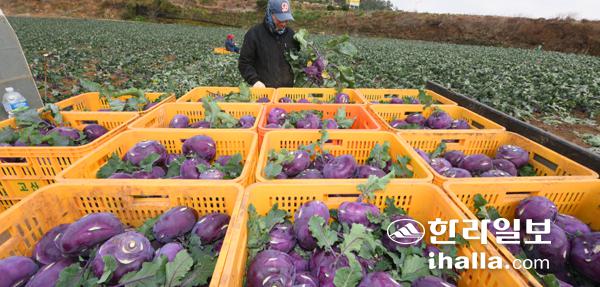 29일 제주시 한경면 고산리 한 밭에서 농민이 콜라비 수확 작업을 하고 있다. 이상국기자