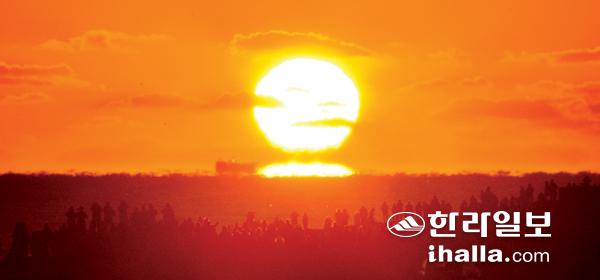 1일 서귀포시 성산읍 광치기 해변에서 도민과 관광객들이 2022년 새해 일출을 보며 코로나19 종식을 통한 일상회복 등 소망을 빌고 있다. 이상국기자