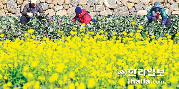 3일 제주시 한경면 고산리 한 농경지에서 농민들이 유채꽃을 앞에두고 콜라비를 수확하고 있다. 강희만기자