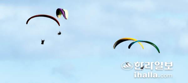 3일 제주시 함덕서우봉에서 관광객들이 패러글라이딩을 하며 제주의 겨울을 만끽하고 있다. 이상국기자