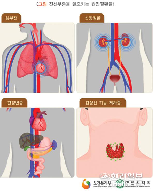 전신 부종의 원인은 우리 몸에서 혈액을 심장으로 이동시키는 정맥 혈관 내의 압력이 증가하거나, 혈액 속의 단백질의 양이 감소하는 경우, 혈관의 투과성이 증가하는 경우가 있을 수 있다. 정맥 혈관 내의 압력이 증가하는 대표적인 질환은 심부전인데, 과거에 심근경색과 같은 관상동맥질환을 앓았고, 고혈압, 당뇨병 등 심혈관 질환 발생의 위험 요소를 가지고 있는 경우 의심해 볼 수 있겠다. 우리 몸에서 전신으로 보내져야하는 혈액이 심부전으로 인해 심장 내에서 정체되고, 팔과 다리 등의 말초조직에서 심장으로 들어가야 할 혈액이 정맥 내에 머무르게 돼 환자는 전신 부종을 호소하게 된다. 수분이 폐에서도 정체되는 폐부종도 흔히 동반돼 호흡곤란을 호소하는 경우도 많다.