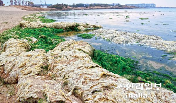 4일 서귀포시 성산읍 신양해수욕장에 끝없이 밀려온 파래가 잔뜩 쌓여 있다. 강희만기자