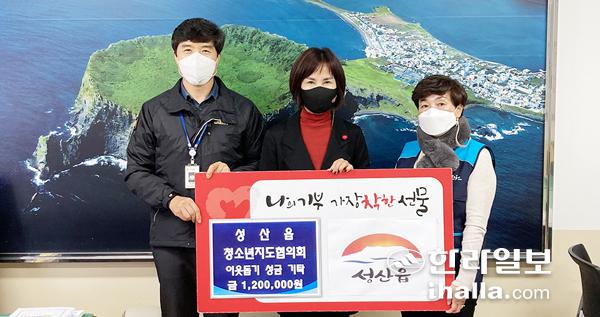 성산읍 청소년지도협의회(회장 정덕숙)는 지난 5일 서귀포시 성산읍(읍장 현길환)을 방문, 겨울철 소외되고 취약한 겨울을 보내고 있는 지역 내 청소년을 위해 사용해 달라며 이웃돕기 성금 120만원을 기탁했다.