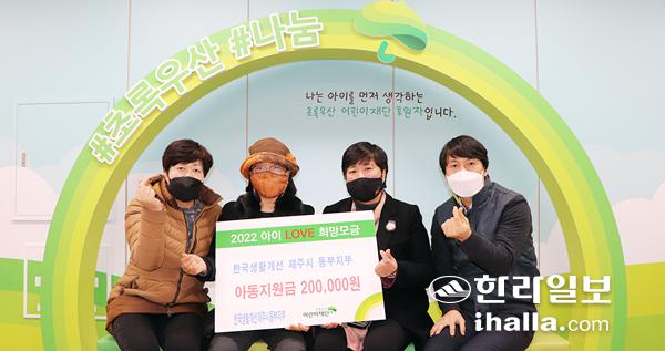 한국생활개선 제주시 동부지부(지부장 조은숙)는 지난 5일 초록우산 어린이재단 제주지역본부(본부장 김희석)에 연말 아동지원금 20만원을 전달했다. 이번 후원금은 도내 소외아동가정에 지원될 예정이다.