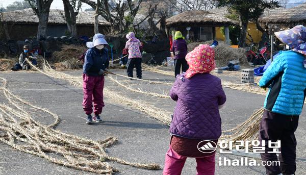 6일 서귀포시 표선면 성읍민속마을 공한지에서 마을 어르신들이 초가에 새로 이을 집줄놓기 작업을 하고 있다. 강희만기자