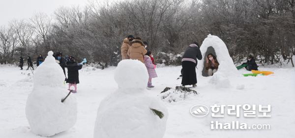 8일 눈이 쌓인 1100고지를 찾은 도민과 관광객들이 눈놀이를 하며 즐거운 시간을 보내고 있다. 이상국기자