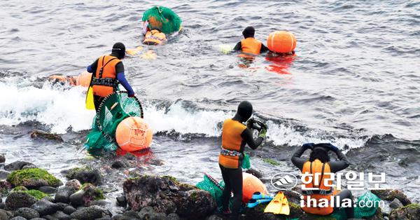 9일 제주시 한림읍 수원리 해안가에서 해녀들이 물질작업을 하기위해 시린 겨울바다로 향하고 있다. 강희만기자