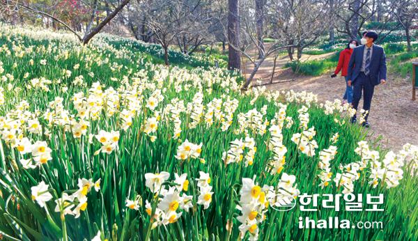 10일 수선화가 만개한 제주시 한림공원에서 관광객들이 사진을 찍으며 즐거운 시간을 보내고 있다. 이상국기자