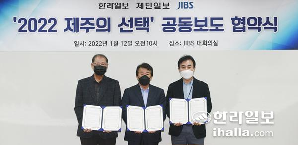 한라일보·제민일보·JIBS 등 제주지역 대표 언론 3사는 12일 JIBS제주방송 3층 대회의실에서 '2022제주의 선택' 공동보도 협약을 체결했다. 한라일보 등 3사는 협약에 따라 오는 3월9일 실시되는 제20대 대통령선거와 6월1일 치러지는 제8회 전국동시지방선거 과정에서 올바른 선거문화가 제주도민사회에 정착할 수 있도록 협력하기로 했다. 이상국 기자