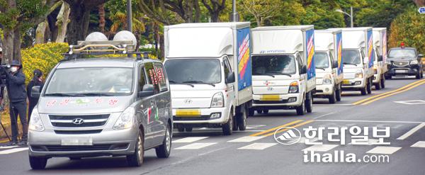 전국택배노동조합 제주지부는 13일 제주도청 앞에서 기자회견을 열고 CJ대한통운 파업 해결을 촉구하며 택배 차량 10여 대를 동원해 차량 행진을 진행했다. 이상국기자