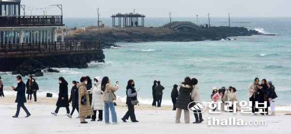 흐린 날씨를 보인 16일 제주시 조천읍 함덕해수욕장을 찾은 관광객들이 바다를 배경으로 사진을 찍으며 주말을 보내고 있다. 이상국기자