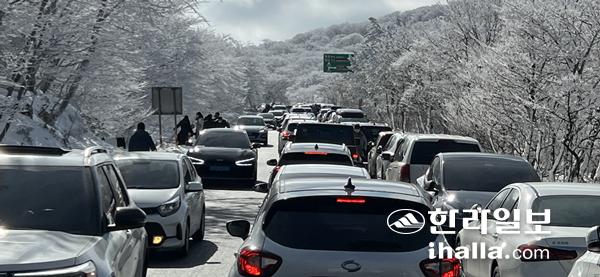 지난 14일 한라산 1100도로에는 설경을 즐기려는 도민·관광객들의 차량들로 북적였다. 이태윤기자