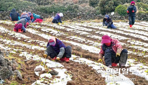 17일 제주시 구좌읍 종달리 한 밭에서 농민들이 모종 파종작업을 하고 있다. 강희만기자