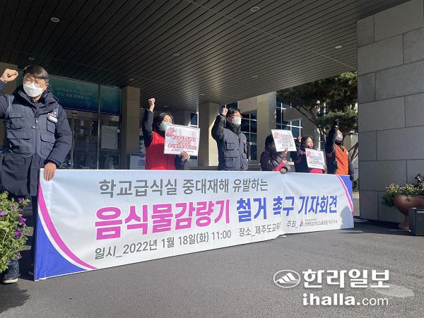학교 비정규직 노조는 18일 제주도교육청 앞에서 기자회견을 통해 감량기 철거를 촉구했다. 송은범기자