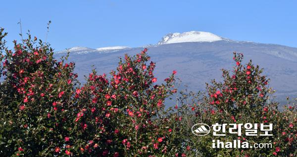 18일 서귀포시 남원읍 휴애리자연생활공원에 활짝 피어난 빨간 애기동백꽃이 만설을 이룬 한라산과 어우러지며 장관을 연출하고 있다. 강희만기자