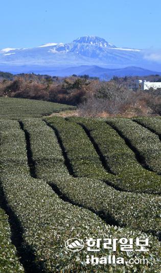 20일 서귀포시 안덕면 서광리 오설록 녹차밭과 한라산 만설이 어우러져 한폭의 풍경화를 만들어 내고 있다. 강희만기자