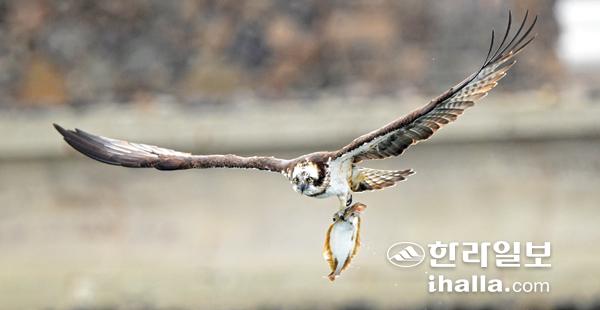 20일 제주시 한경면 금등리 해안에서 물수리 한마리가 광어를 낚아채 날아가고 있다. 강희만기자