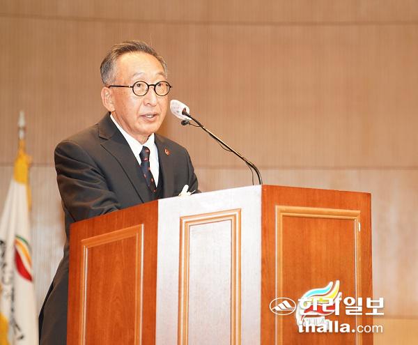 고희범 제8대 4·3평화재단 이사장이 지난 21일 취임식에서 취임사를 하고 있다. 사진=제주도 제공