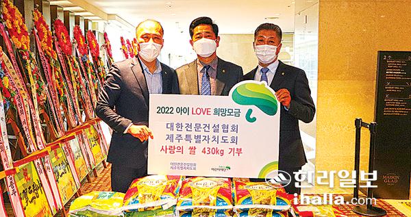대한전문건설협회 제주특별자치도회(회장 백상훈)는 지난 20일 메종글래드 제주에서 열린 제37회 정기총회에서 초록우산 어린이재단 제주지역본부(본부장 김희석)에 사랑의 쌀 430㎏을 전달했다.